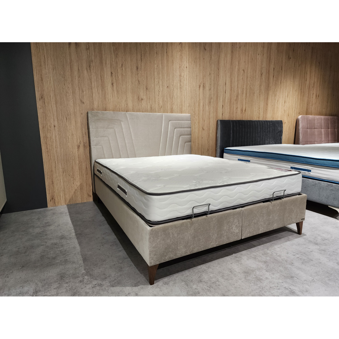 Кровать (база) TERA, щитовой конструкции на декоративных ножках c подъемным жестким основанием под матрас, с изголовьем. Щитовой каркас кровати плита ЛДСП т.18мм, дно плита МДФ 6мм. Каркас обит поролоном т.6мм. Чехол каркаса кровати ткань мебельная с декоративной строчкой в изножье на основе поролона т.6мм, спанбонда. Жесткое основание кровати рамочной металлической конструкции на основе трубы профильной размером 20х30,20х20 с подъемным механизмом. Настил основания поролон т.3мм, основание обито тканью. Сборка каркаса базы на шкант пластмассовый, скобу металлическую, уголок пластмассовый. Подъемный механизм устанавливается при помощи винтов и винтов с гайками. На дно базы устанавливается аэратор пластмассовый с логотипом Bellona  для    кондиционирования воздуха. Ножки кровати пластмассовые, четыре ножки декоративные, четыре опорные круглые ввинчивающиеся для двойных баз. Ручка -держатель для подъемного основания металлическая.