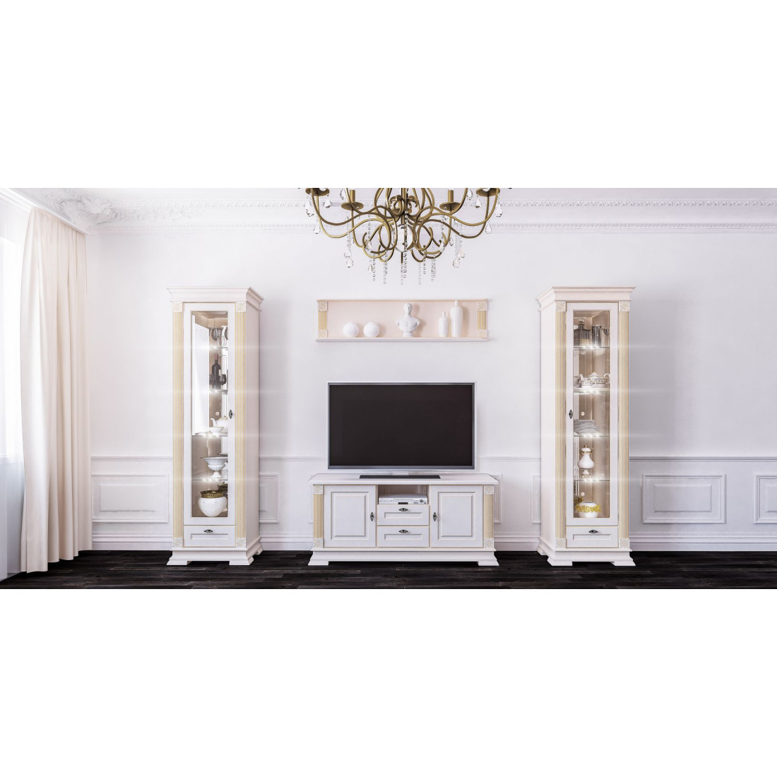 Витрины гостиной Афина послужат прекрасной основой, а тумба для телевизора и настенная полка, прекрасным дополнением комплекта.