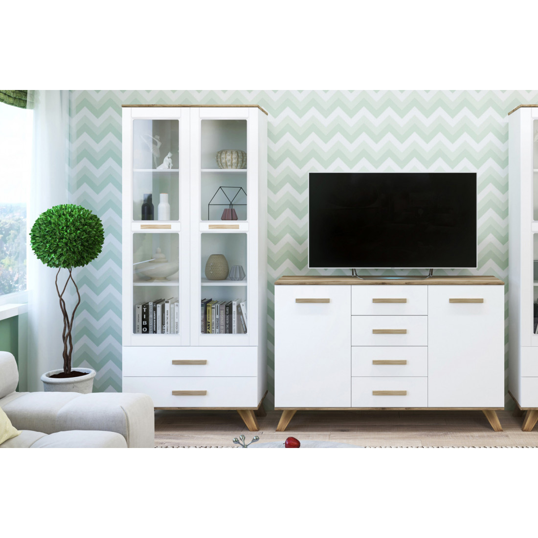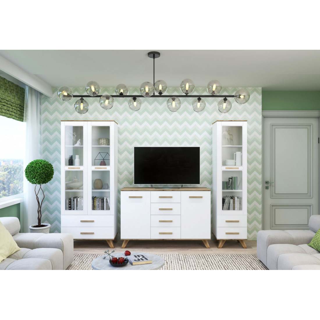 Витрины с прозрачным стеклом и многофункциональный комод в скандинавском стиле. Витрины позволят хранить посуду, книги и другие вещи. В нижней части шкафов-витрин предусмотрены выдвижные ящики. В центральной части композиции стоит большой комод - это  вместительный элемент гостиной с ящиками и дверцами, который служит для размещения различных элементов, а так же телевизора. набор мебели представлен в исполнении ЛДСП «Дуб каньон» + «белый», фасады - МДФ в пленке ПВХ «глянец белый».