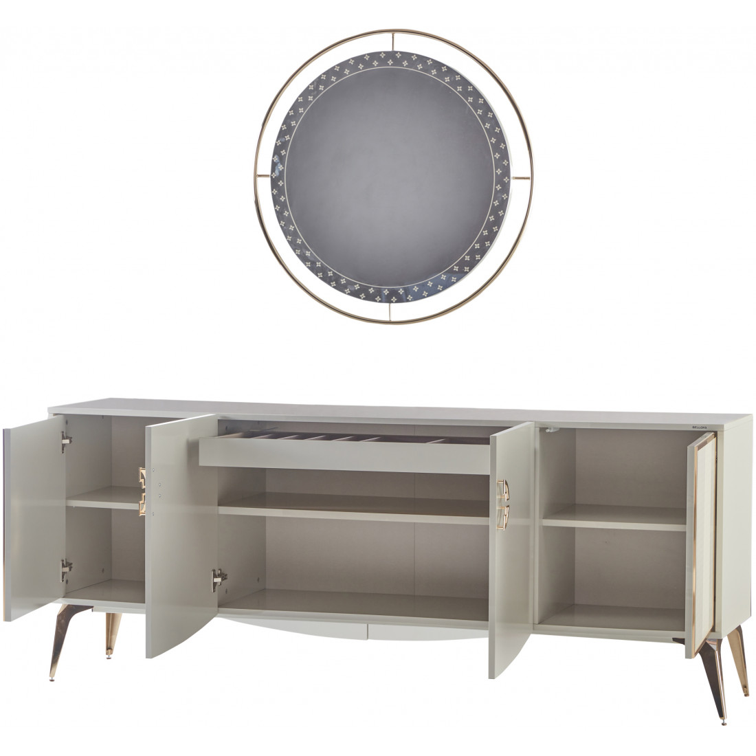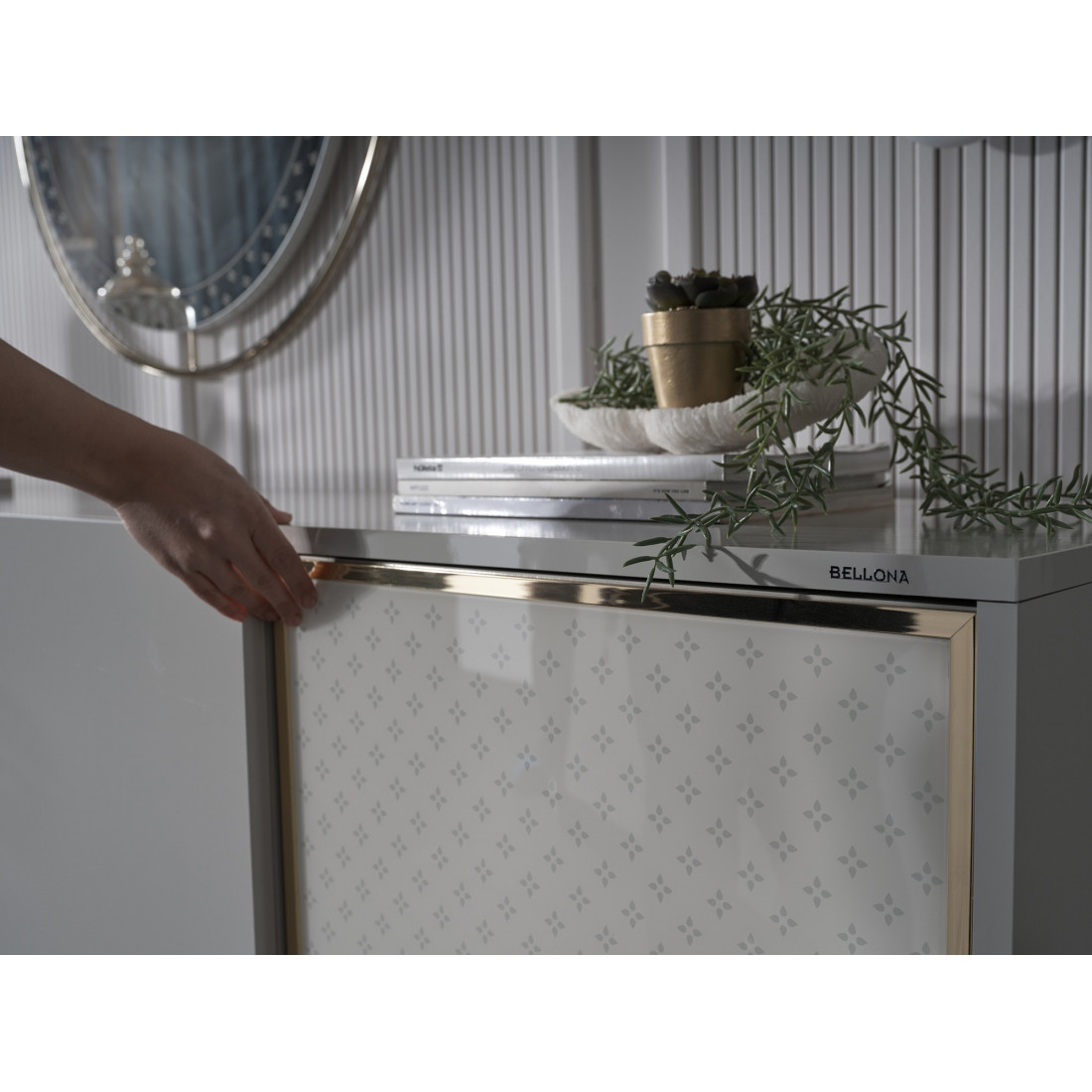 На стеклянных дверях используется система push-to-open и механизм плавного закрывания.