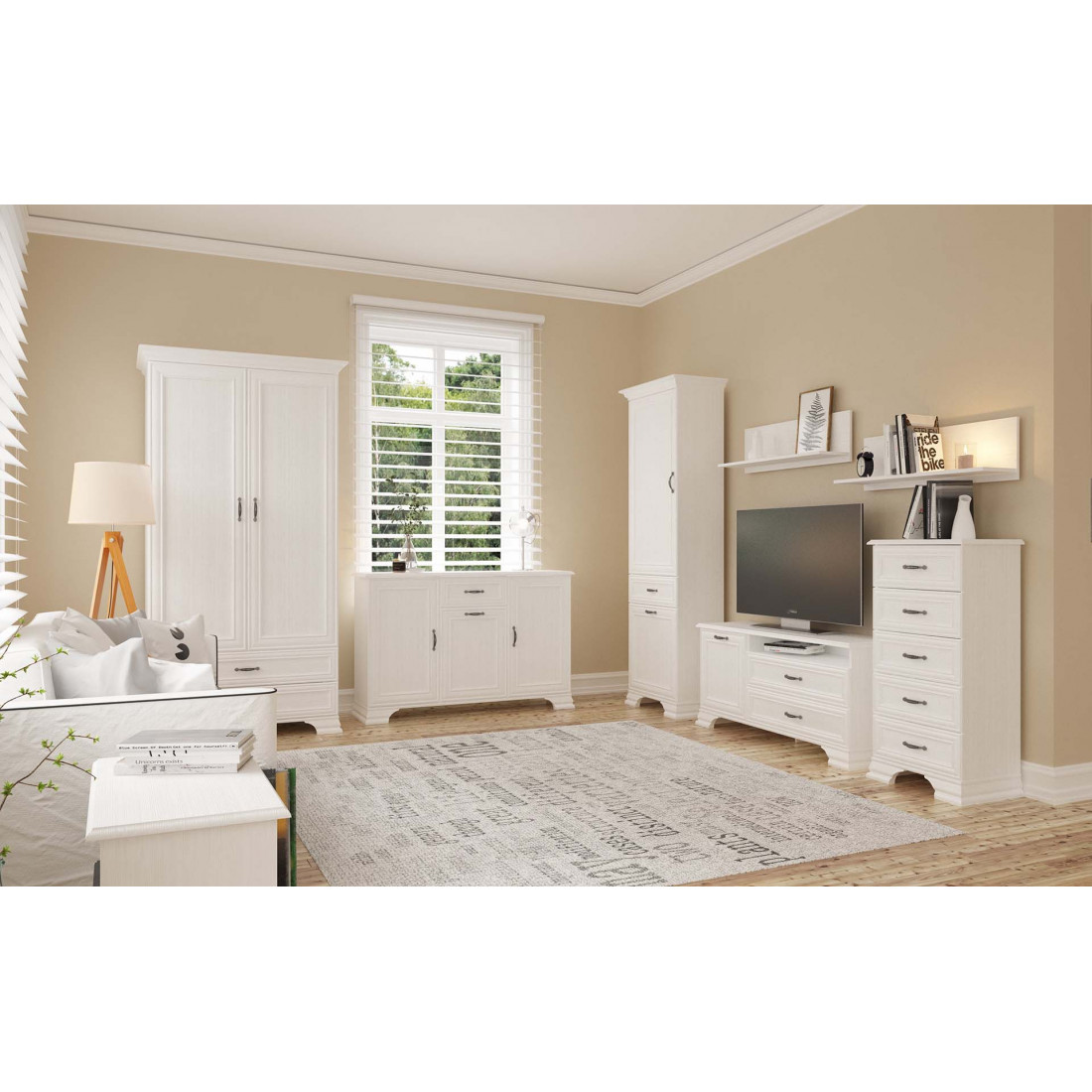 Мебель для гостиной Юнона композиция 4 от фабрики Мебель-Неман - это новинка 2019 года в классическом стиле с отделкой структурной фактуры, обрамленная рамочным фасадом, где металлические ручки выгодно подчёркивают стиль и изящество, всегда актуальна и востребована.