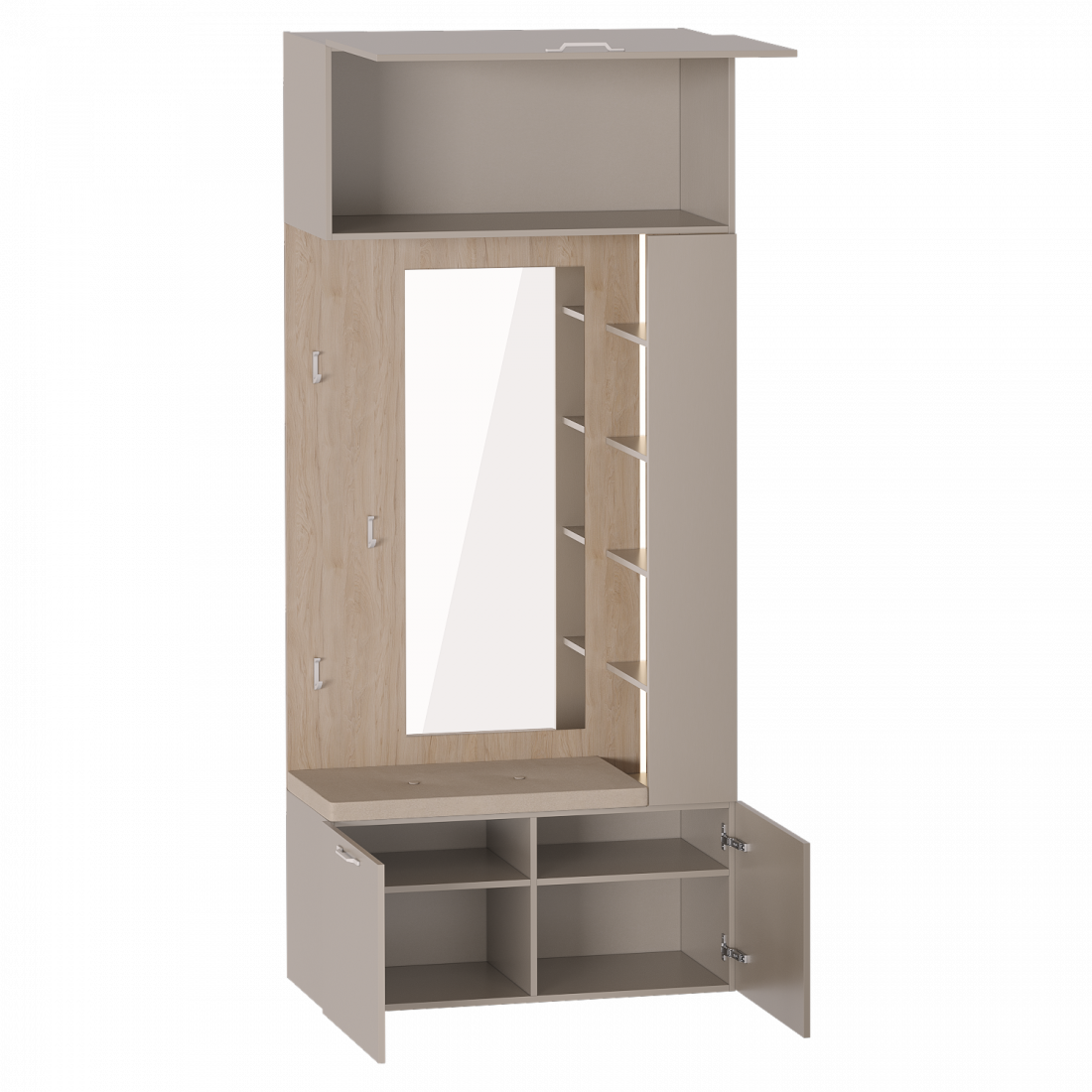 Модуль "Вешалка с зеркалом" выполнен из ЛДСП цвета Дуб натуральный светлый / Капучино. Верхняя полка модуля имеет встроенный газлифт и позволит разместить объемный чемодан. Вертикальный ряд полок со светодиодной подсветкой выполнен на правую сторону, при желании можно распахнуть створку, прикрывающую ряд. Прочные крючки выполнены из белого матового металла.