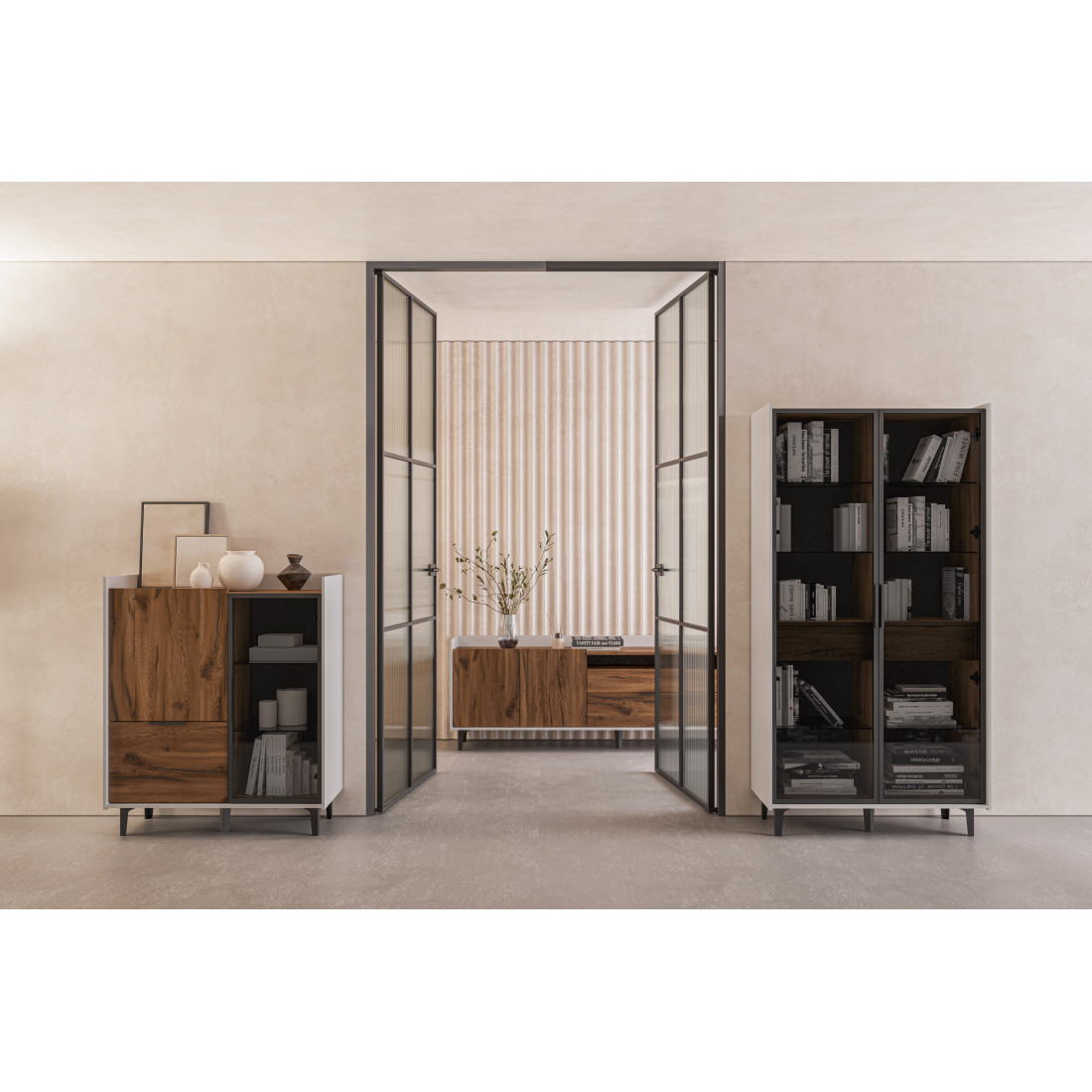 Элегантный шкаф Модена создает изысканную атмосферу в вашей гостиной. Предлагается в трех стильных вариантах цветов: Белый-Дуб Элисон, Лунный камень-жемчуг, Металл Бруклин-лунный жемчуг. Ножки из металла обеспечивают прочную поддержку. Темное стекло добавляет утонченности дизайну. Шкаф оснащен двумя отделениями с элегантными стеклянными полками и фасадами, между которыми находится большой ящик для удобного хранения. Идеальное решение для организации пространства в вашей гостиной