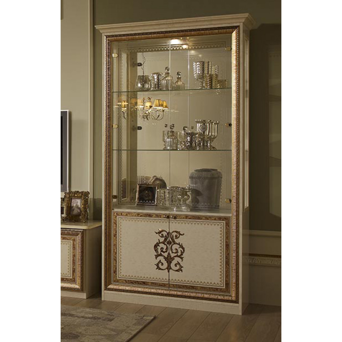 Шкаф-витрина двухдверный Анита (бежевый глянец) от Российской фабрики «ДИА мебель» Выполнена в цвете бежевый глянец с отделкой золотых фасадов. Классический стиль придают интерьеру неповторимую уникальность и роскошь. Изгибающиеся линии придают легкость и воздушность гостиной либо столовой. Коллекция "Анита" придаст вашему дому экстравагантность и принесет свежие нотки.