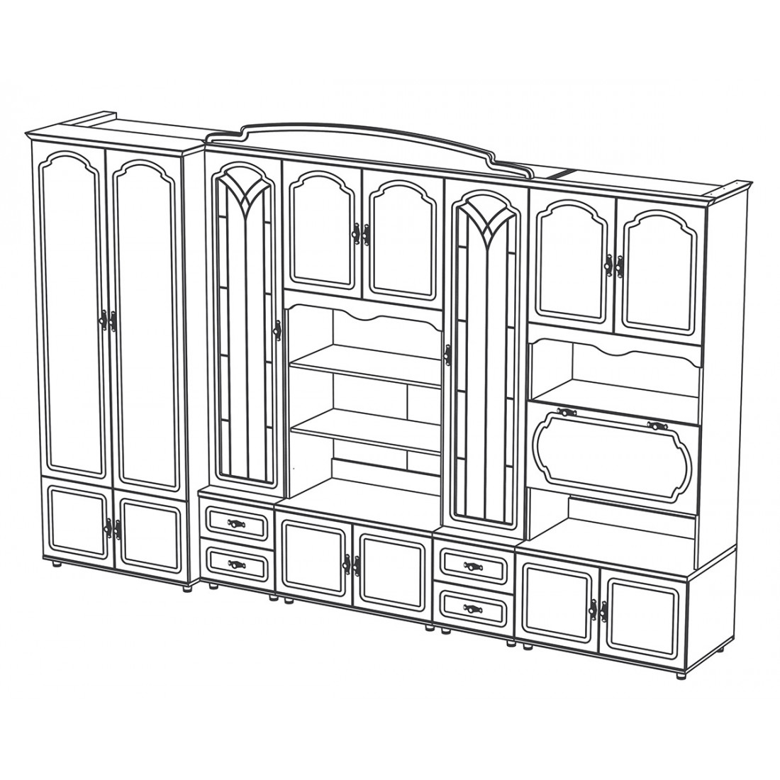 Стенка в гостиную "Романитка"  не устаревающая классика на все времена.Длина стенки 3240мм, высота 2180мм, глубина 610мм. Вместительный шкаф для одежды, закрытые полочки для белья, ящики для хранения вещей , ниша под ТВ . Многофункциональная, в классическом цвете "орех темный" стенка в гостиную "Романитка ВК-09.01"  отлично впишется в интерьер дома, квартиры, уютного коттеджа.