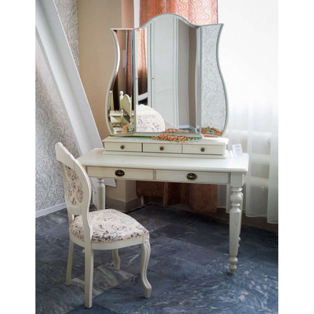 Такой изысканный предмет обстановки, как туалетный стол Лика, производства «Молодечномебель», уместен в любой комнате. Вместе с тем, изделие весьма функционально. Столик оснащен удобным тройным зеркалом и четырьмя небольшими выдвижными ящиками.